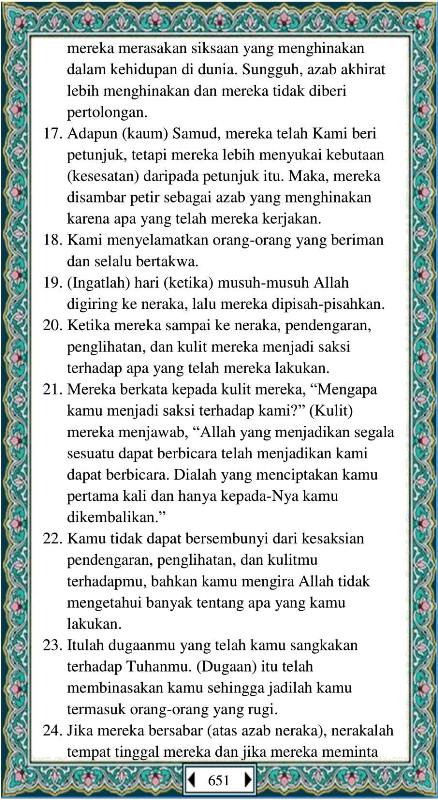 Al Quran Juz 24 dan Terjemahannya lengkap yaitu dimulai dari Surat ke 39 Az Zumar (Rombongan) ayat 32 sampai ayat 75, Surat ke 40 Ghafir (Maha Pengampun) ayat 1-85 dan berakhir pada Surat ke 41 Fussilat (Yang Dijelaskan) ayat 1-46.